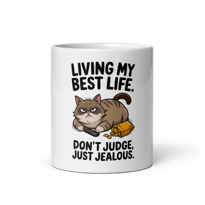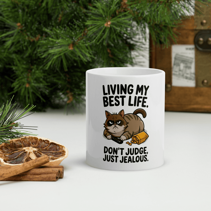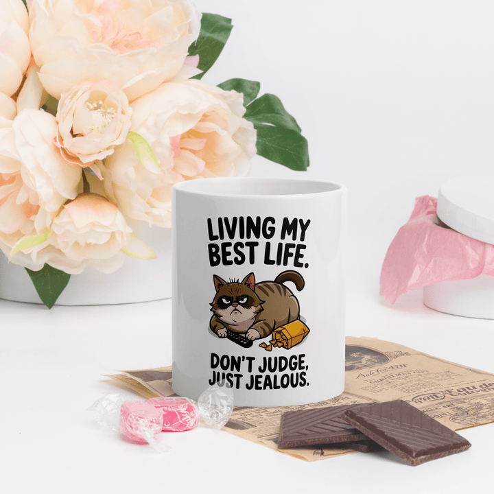 Our “Living My Best Life – Don’t Judge, Just Jealous” cat mug is the purr-fect blend of personality and practicality. Whether you're sipping coffee, tea, or cocoa, this mug is a daily reminder to stay confident, bold, and just a little bit cheeky.